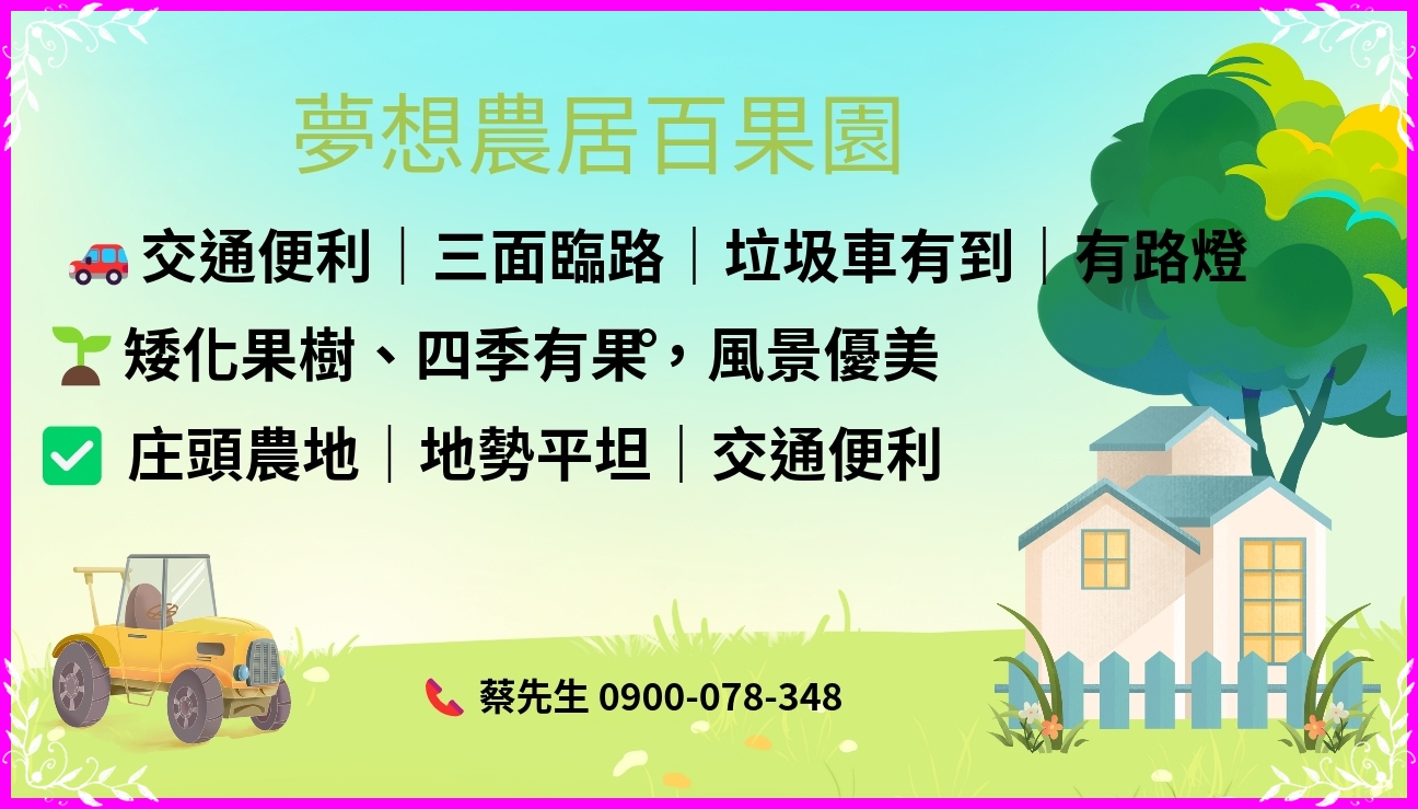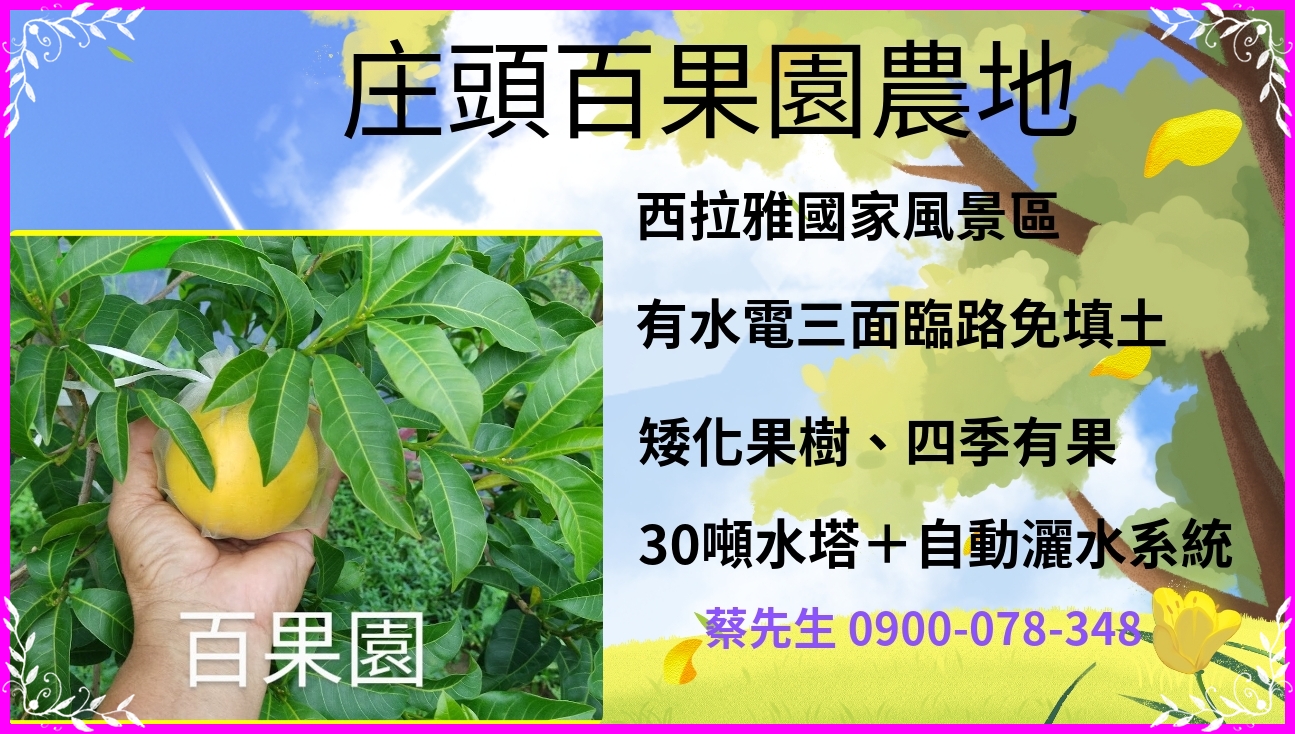 #庄頭 #百果園 #農地 #水 #電 #三面臨路 #免填土 #交通便利 #三面臨路 #垃圾車有到 #前後有路燈 #有電 #有水 #(井水) #30噸鋁合金水塔 #專業全自動灑水系統 #儲水桶 #設施齊全 #矮化果樹 #四季有果 #自耕自住 #退休養生 #快樂農夫 #假日農場 #親子採果樂 #台南土地 #庄頭百果園農地 #庄頭農地 #台南農地 #庄頭土地